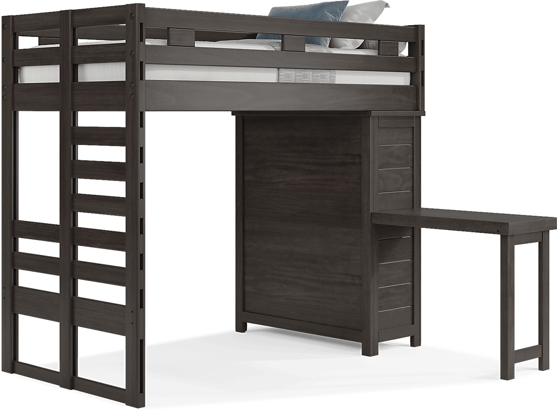 Get a space saving solution without sparing on timeless style appeal when you choose the Creekside 2.0 loft bed for your child's room. Crafted of pine solids and veneers in charcoal finish, this bed sits atop a loft that features a storage loft chest on one side with a ladder built into the opposite side of the frame for easy-peasy ups and downs to and from bed. A desk affixed to the frame of the loft makes study time easy, while the area beneath the bed provides space for play, pretend or coordinating furniture. Mattress and foundation sold separately. This product requires a bunkie board (sold separately).