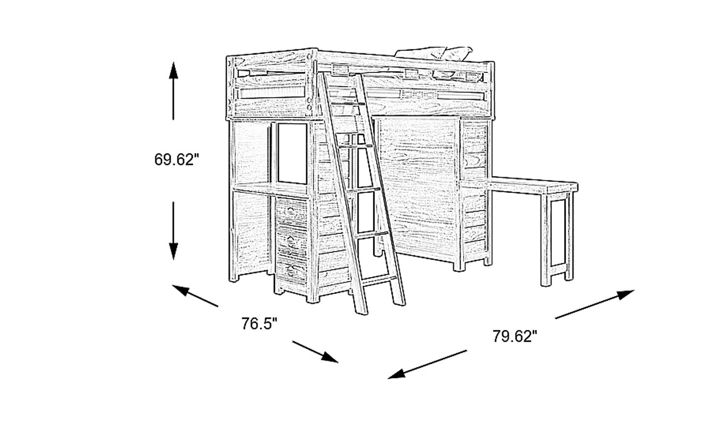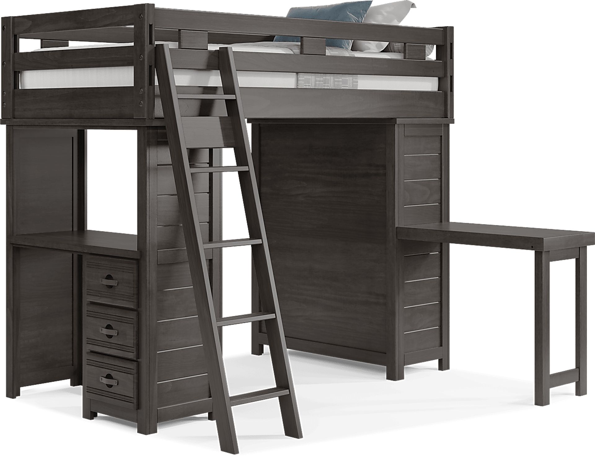 Get a space saving solution without sparing on timeless style appeal when you choose the Creekside 2.0 loft bed for your child's room. Crafted of pine solids and veneers in charcoal finish, this twin-size bed sits atop a loft that has a storage loft chest on one side of the frame with a desk on the opposite end that features three drawers of space for comics, study supplies and more of your child's favorite things. Just beneath the frame, there's ample room for play, pretend or coordinating furniture. Additionally, an accompanying desk attachment affixes to the frame for an extra study surface while a ladder provides easy-peasy ups and downs to and from the bed on top. Mattress and foundation sold separately. This product requires a bunkie board (sold separately).