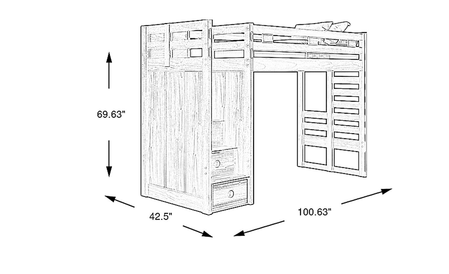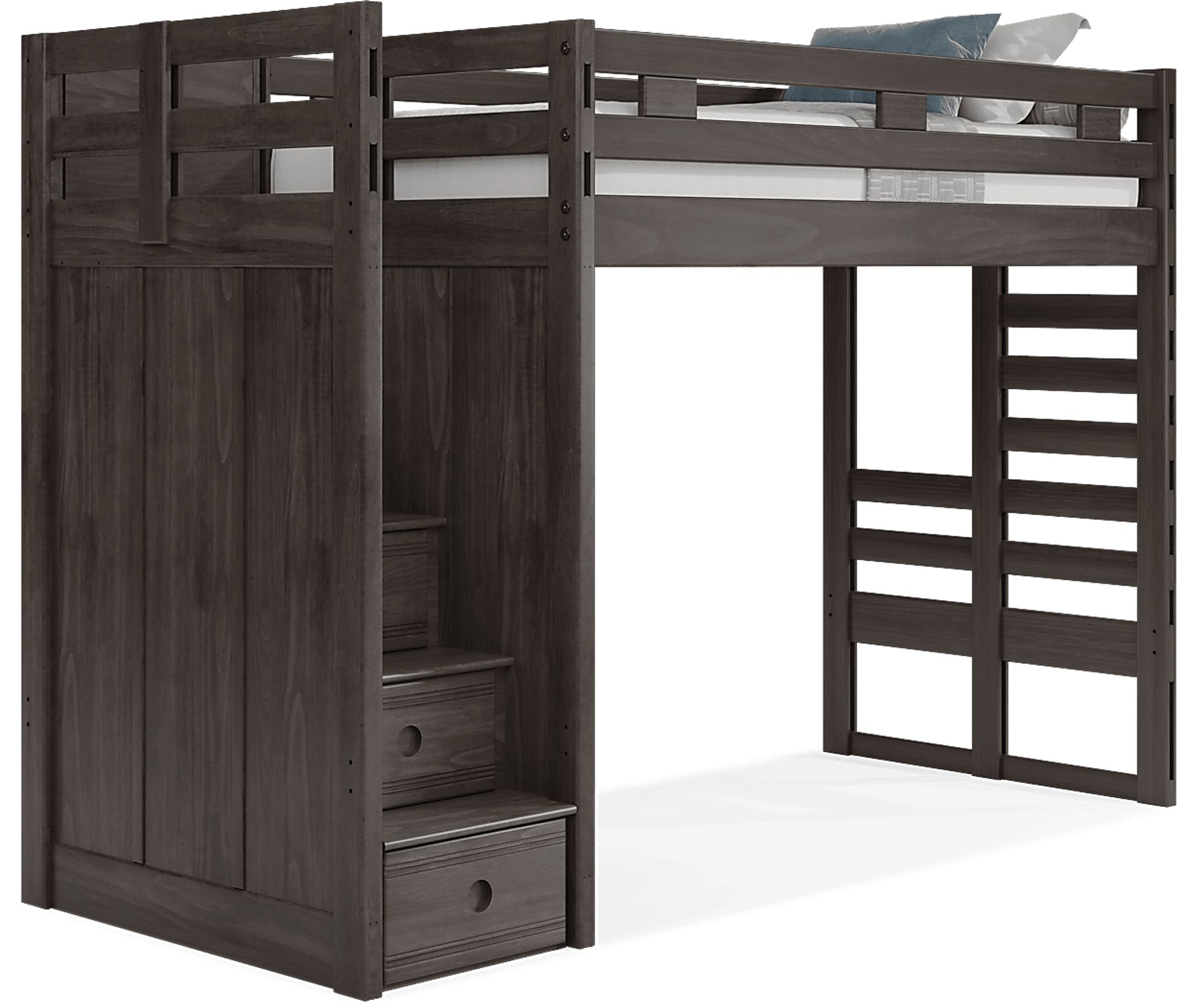 Get a space saving solution without sparing on timeless style appeal when you choose the Creekside 2.0 loft bed for your child's room. Crafted with pine veneers in charcoal finish, this twin bed sits atop a loft that features a ladder built into the side of the frame with five steps configured onto the opposite end for easy-peasy ups and downs to and from bed. Additionally, four of the steps have drawers to help store away some of your child's favorite things. Just beneath the bed, there's ample space for play, pretend or coordinating furniture. Mattress and foundation sold separately. This product requires a bunkie board (sold separately).