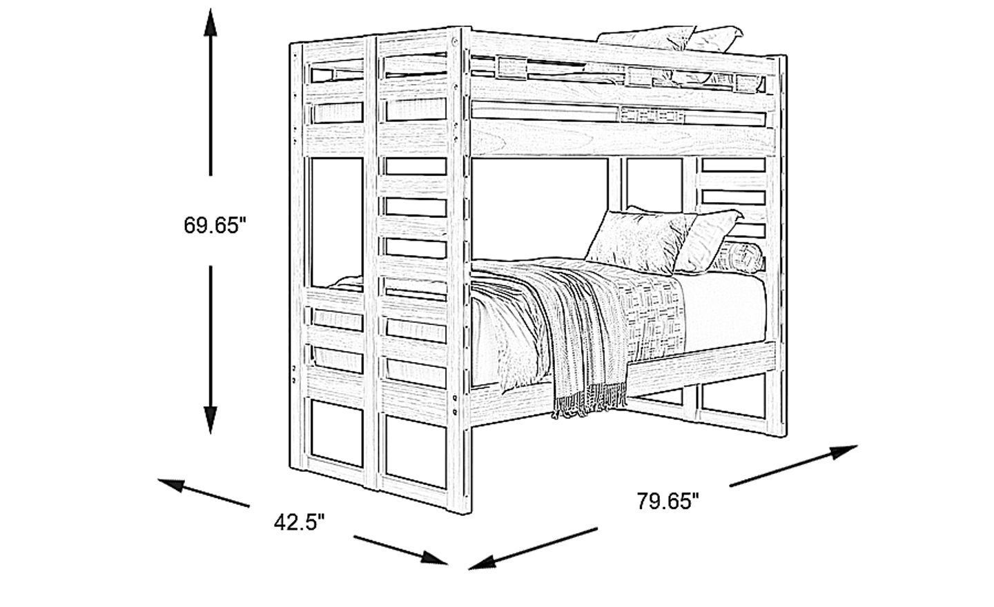 With a total height of approximately 69.65 inches, this bed is an ideal solution for homes with standard eight-foot ceilings. When paired with a standard-depth mattress and a bunkie board, it typically leaves over two feet of clearance to the ceiling, providing enough headroom for a child to sit up comfortably and safely on the top bunk.