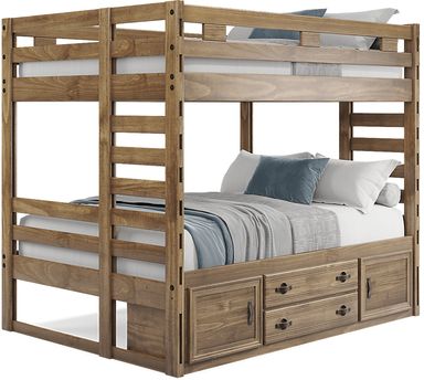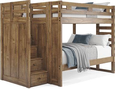 Get a space saving solution without sparing on timeless style appeal when you choose the Creekside 2.0 bunk bed for your child's room. Crafted with pine veneers in a chestnut finish, this full/full step bunk bed features a ladder built into the side of the frame while the other end is configured with five easy-peasy steps to take instead. Additionally, four of the steps have drawers to help store away your child's favorite things, while a storage side rail provides even more bedside storage with two doors and a pair of drawers. Mattresses and foundations sold separately. This product requires a bunkie board (sold separately).
