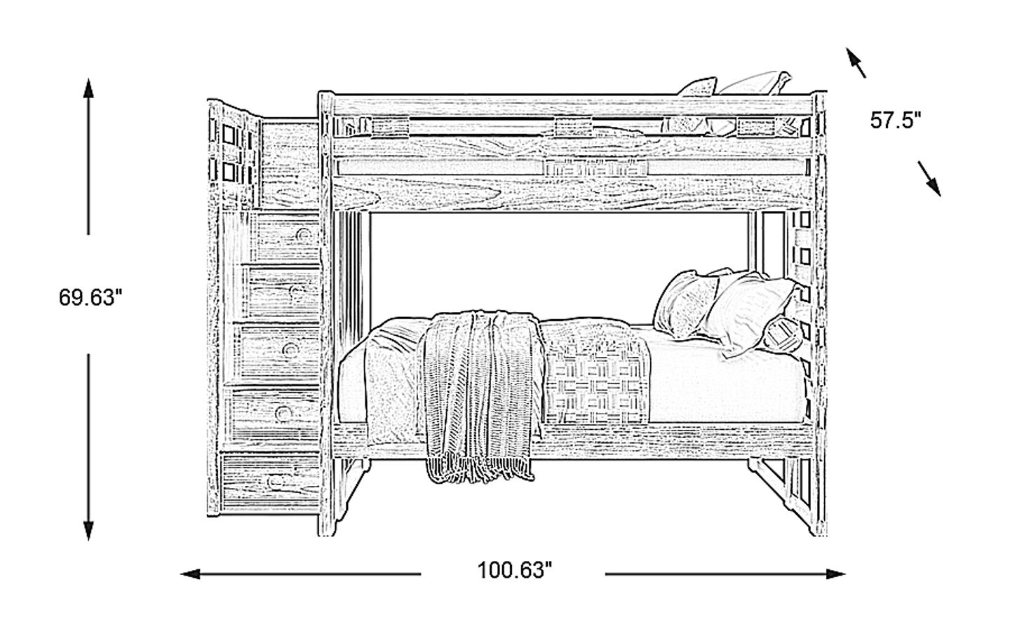 This bed has dimensions of 57.5"w x 100.63"d x 69.63"h. While the full-size bunks provide generous sleeping space, the integrated staircase increases the depth compared to ladder-only models. We recommend this configuration for rooms with at least 10 feet of clear wall space and standard 8-foot ceilings to ensure the top bunk occupant has adequate headroom to sit up safely.