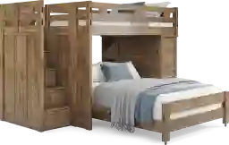 Get a space saving solution without sparing on timeless style appeal when you choose the Creekside 2.0 loft bed for your child's room. Crafted with pine veneers in a warm chestnut finish, this full bed sits atop a loft that features a storage loft chest on one side of the frame with five steps configured onto the opposite end for easy-peasy ups and downs to and from bed. Additionally, four of the steps have drawers to help store away some of your child's favorite things. Just beneath the loft, the full-size castor bed provides an additional place for sleep while a bookcase affixed to the underside of the frame offers perfect shelving for comics, magazines, books and more. Mattresses and foundations sold separately. This product requires a bunkie board (sold separately).
