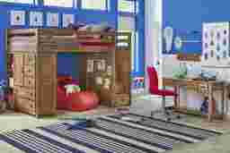 Get a space saving solution without sparing on timeless style appeal when you choose the Creekside 2.0 loft bed for your child's room. Crafted of pine solids and veneers in a warm chestnut finish, this full bed sits atop a loft that features a storage loft chest on one side of the frame with five steps configured onto the opposite end for easy-peasy ups and downs to and from bed. Additionally, four of the steps have drawers to help store away some of your child's favorite things. Just beneath the bed, a bookcase provides perfect shelving for comics, magazines, books and more. Mattress and foundation sold separately. This product requires a bunkie board (sold separately).