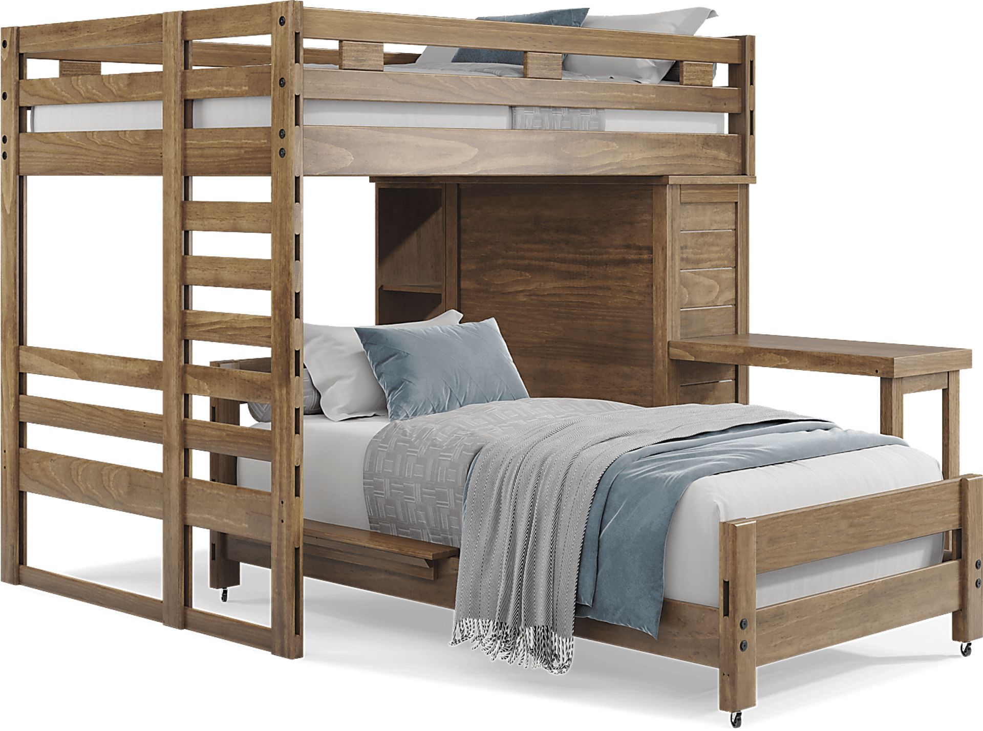Get a space saving solution without sparing on timeless style appeal when you choose the Creekside 2.0 loft bed for your child's room. Crafted of pine solids and veneers in a warm chestnut finish, this full loft bed sits atop a loft that features a storage loft chest on one side of the frame with a ladder built into the opposite side for easy-peasy ups and downs to and from bed. A desk attachment affixed to the frame of the loft makes study time easy, while the area beneath the bed features a bookcase perfect for shelving comics, magazines, books and more. Additionally, the twin-size caster bed provides an exceptional place to sleep nestled beneath the loft. Mattresses and foundations sold separately. This product requires a bunkie board (sold separately).