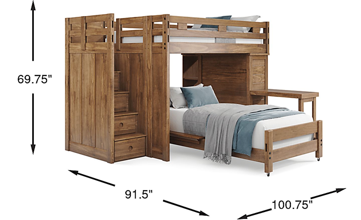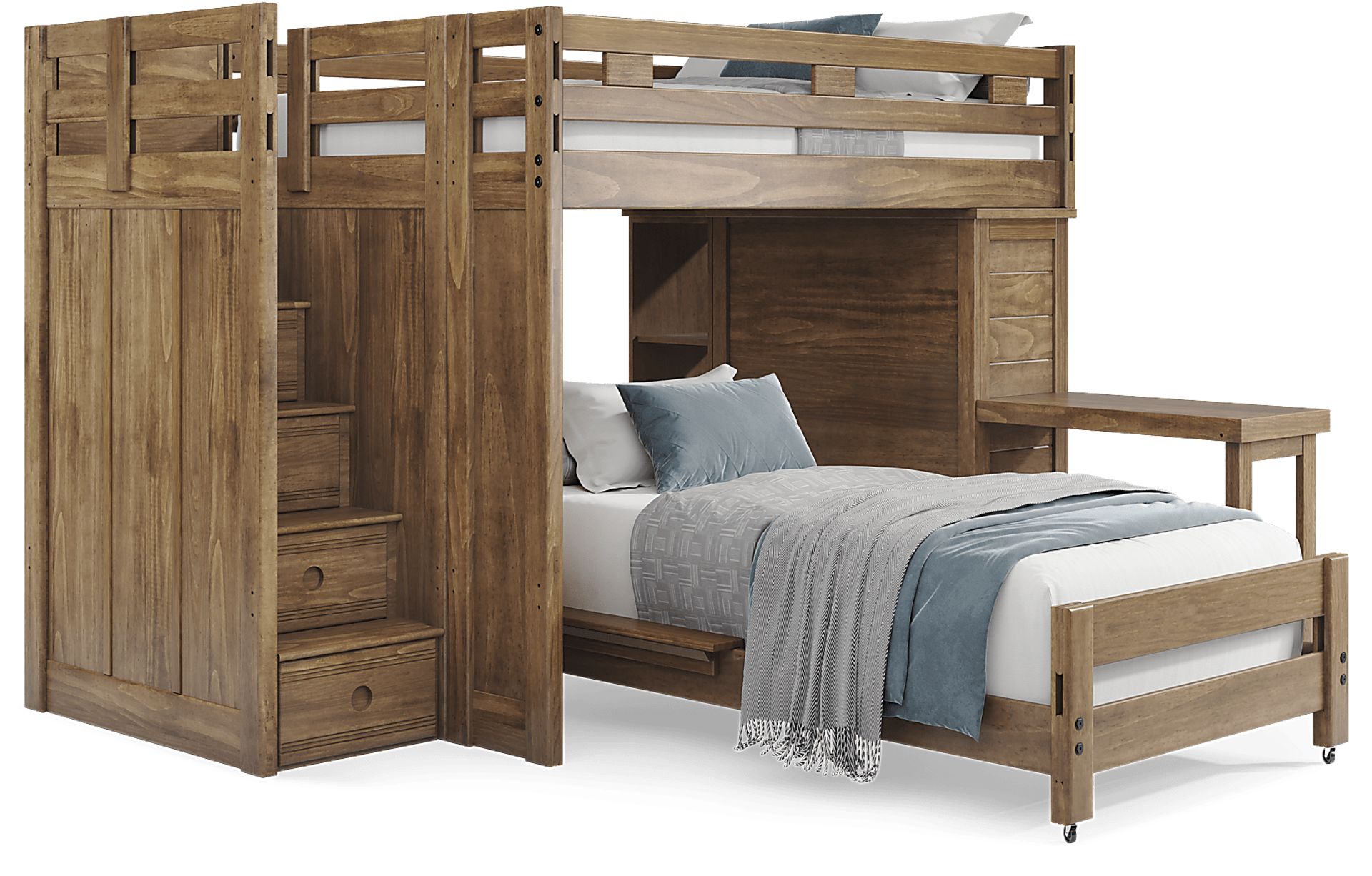 Get a space saving solution without sparing on timeless style appeal when you choose the Creekside 2.0 loft bed for your child's room. Crafted of pine solids and veneers in a warm chestnut finish, this full bed sits atop a loft that features a storage loft chest on one side of the frame with five steps configured onto the opposite end for easy-peasy ups and downs to and from bed. Additionally, four of the steps have drawers to help store away some of your child's favorite things. Just beneath the loft, the twin-size castor bed provides an exceptional place for sleep while a bookcase affixed to the underside of the frame offers perfect shelving for comics, magazines, books and more. An accompanying desk attachment provides an additional surface for reading, studying and more. Mattresses and foundations sold separately. This product requires a bunkie board (sold separately).
