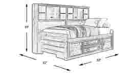 This bed is designed to be a comprehensive space-saving solution for a child's room. It features a bookcase headboard with integrated wire management for electronics and favorite books, keeping essentials within reach. Additionally, the storage side rail is equipped with two doors and two drawers, providing dedicated space for everything from toys and comics to extra bedding, effectively acting as a low-profile dresser.