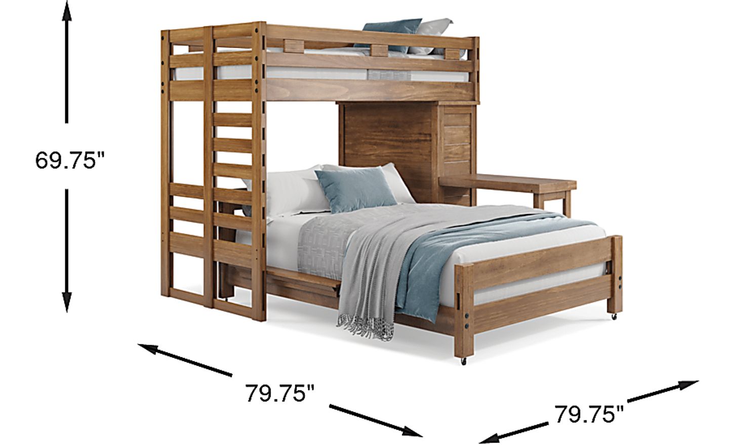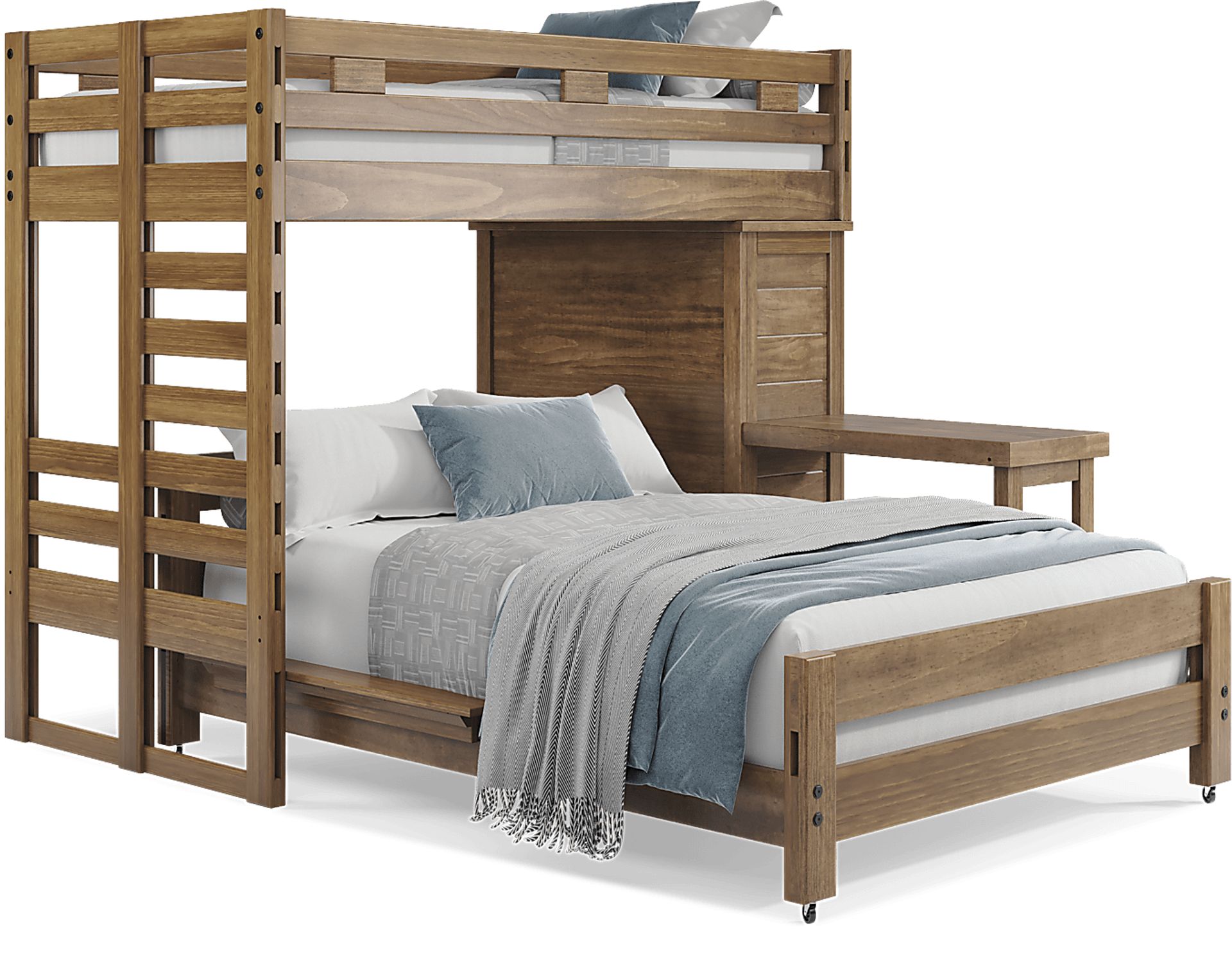 Get a space saving solution without sparing on timeless style appeal when you choose the Creekside 2.0 loft bed for your child's room. Crafted of pine solids and veneers in a warm chestnut finish, this bed sits atop a frame that features a storage loft chest on one side with a ladder built into the opposite end of the frame for easy-peasy ups and downs to and from bed. A desk attachment affixed to the frame provides a perfect surface for reading, studying and more. Just beneath the frame, the full-size caster bed offers another place to sleep. Mattresses and foundations sold separately. This product requires a bunkie board (sold separately).