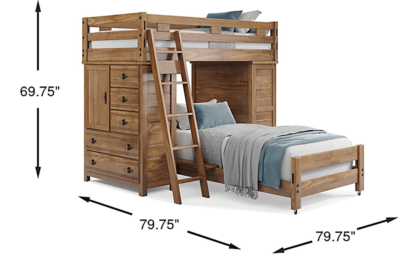 Get a space saving solution without sparing on timeless style appeal when you choose the Creekside 2.0 loft bed for your child's room. Crafted of pine solids and veneers in a warm chestnut finish, this twin-size bed sits atop a frame that features two storage chests equipped with ample space for clothes, accessories and even more of your child's favorite things. Additionally, an accompanying ladder provides easy-peasy ups and downs to and from the loft bed on top. Just beneath the frame, the twin-size caster bed offers another place to sleep. Mattresses and foundations sold separately. This product requires a bunkie board (sold separately).