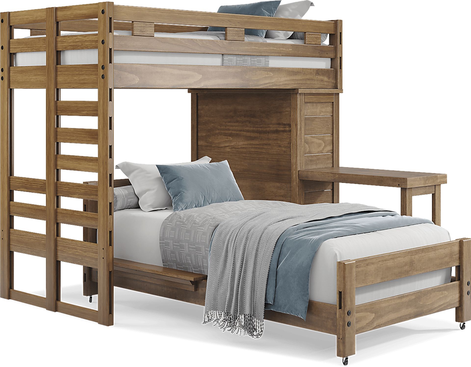 Get a space saving solution without sparing on timeless style appeal when you choose the Creekside 2.0 loft bed for your child's room. Crafted of pine solids and veneers in a warm chestnut finish, this bed sits atop a loft that features a storage loft chest on one side with a ladder built into the opposite side of the frame for easy-peasy ups and downs to and from bed. A desk affixed to the frame of the loft makes study time easy, while the area beneath the frame provides space for the twin-size caster bed. Mattresses and foundations sold separately. This product requires a bunkie board (sold separately).
