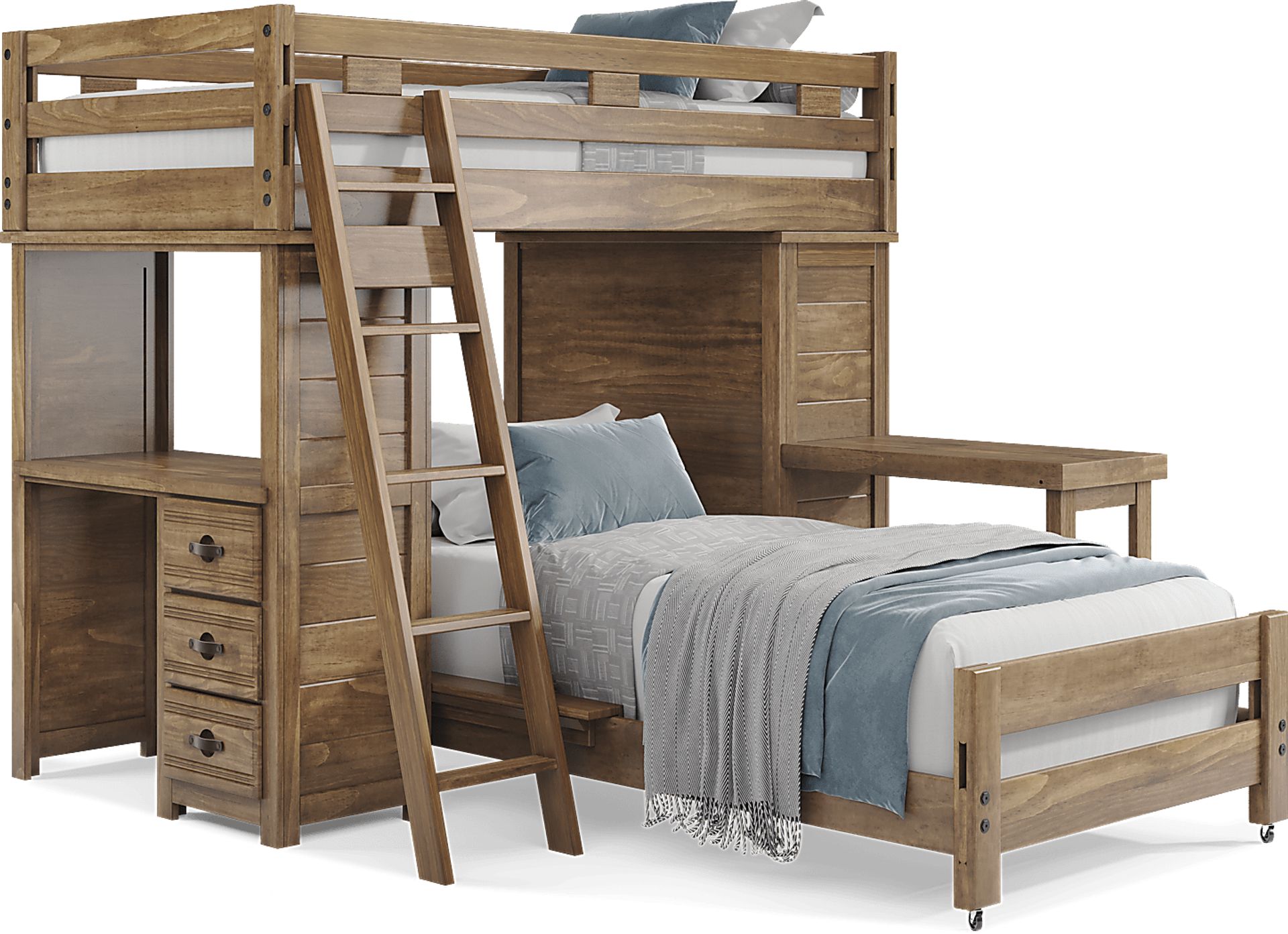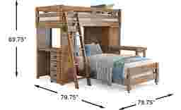 Get a space saving solution without sparing on timeless style appeal when you choose the Creekside 2.0 loft bed for your child's room. Crafted of pine solids and veneers in a warm chestnut finish, this twin-size bed sits atop a loft that has a storage loft chest on one side of the frame with a desk on the opposite end that features three drawers of space for comics, study supplies and more of your child's favorite things. Additionally, an accompanying desk attachment affixes to the frame for an extra study surface while a ladder provides easy-peasy ups and downs to and from the bed on top. Just beneath the frame, a twin-size caster bed offers another place to sleep. Mattresses and foundations sold separately. This product requires a bunkie board (sold separately).