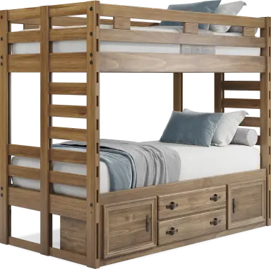Get a space saving solution without sparing on timeless style appeal when you choose the Creekside 2.0 bunk bed for your child's room. Crafted with pine veneers in a chestnut finish, this twin/twin step bunk bed features a ladder built into the side of the frame while the other side is configured with five easy-peasy steps to take instead. Additionally, four of the steps have drawers to help store away your child's favorite things. Mattresses and foundations sold separately. This product requires a bunkie board (sold separately).