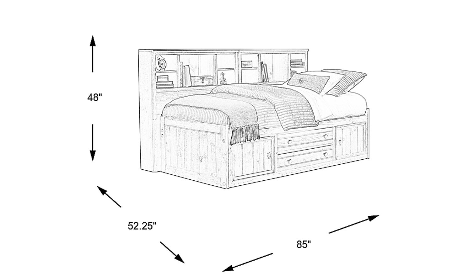 The space saving Creekside bookcase captain's bed is a wonderful choice for your child's room. The side features two center shelves great for displaying books, pictures, or other favorite objects right at the bedside. A captain's pedestal beneath the bed offers two drawers and additional storage behind two doors. Crafted of pine solids and veneers, this stylish piece is built to last. Mattress and foundation (if required) sold separately.
