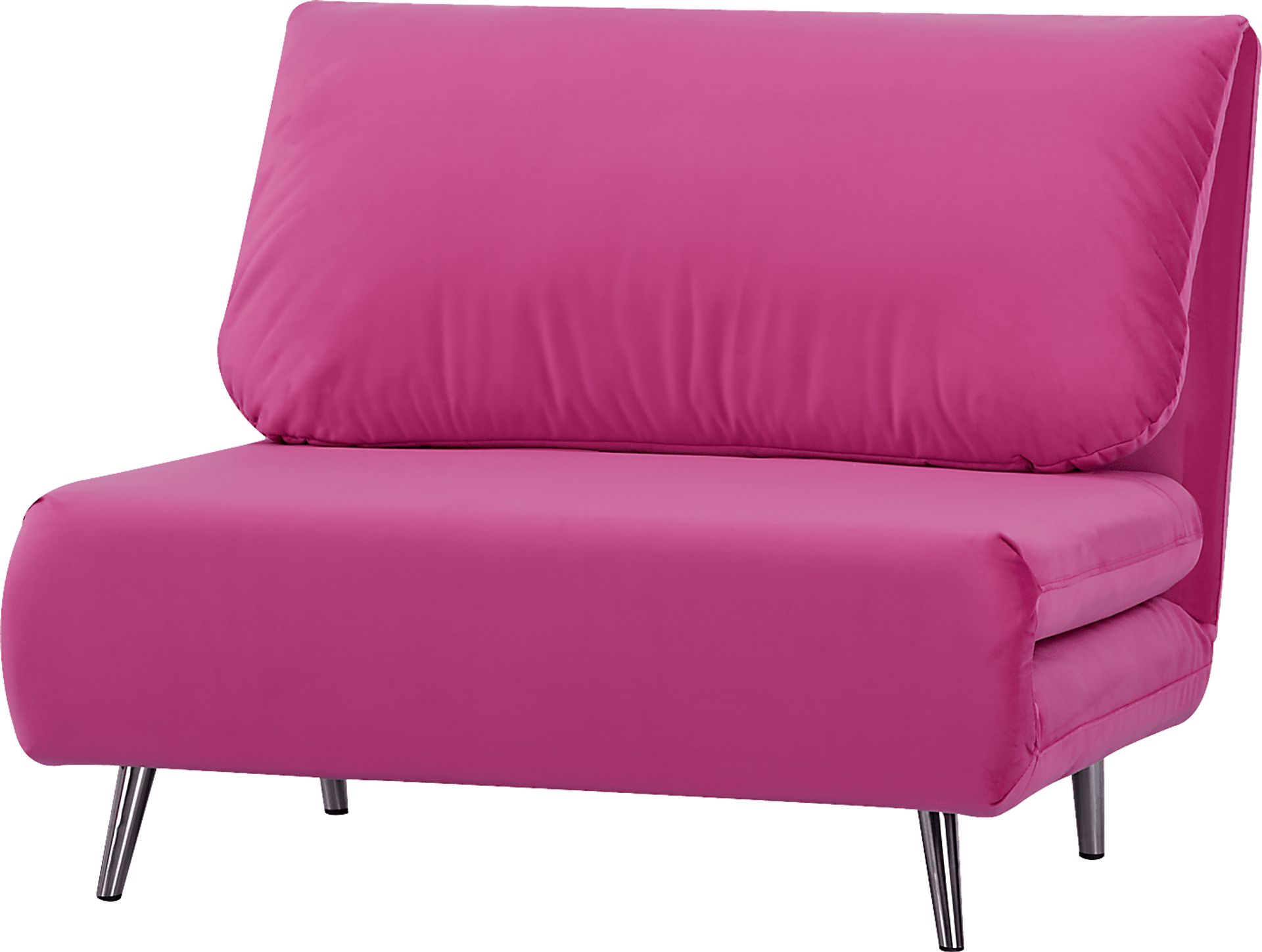 Settee by day and sleepover style by night, the Daydream convertible chair is everything you've been dreaming of and more! The comfy pillow shaped back has a three-point ratcheting click-clack mechanism that's as fun to reposition as it is to say. You won't believe how easy it is to unfurl the seat, swiftly transforming the chair into the perfect resting place for overnight friends. Upholstered with soft fabric that has a velvet-like texture in a jewel-tone pink color, the piece's metal legs are finished in shimmering chrome for the perfect final touch. 100% Polyester