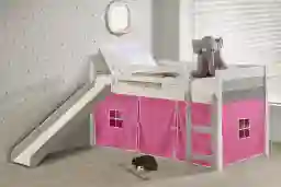 This Debuel twin loft is the perfect starter bed for your little one. The slide feature provides a fun way to get out of bed. The pink tent provides the perfect hidden play area where imaginations can run wild. Customer assembly required.
