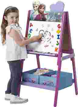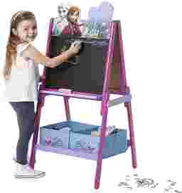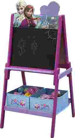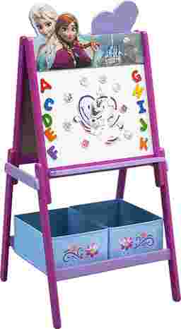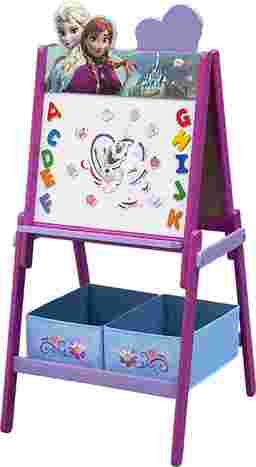 Sure to inspire the sweetest sketches, this Frozen wooden double sided activity easel with storage is designed with a magnetic, dry-erase surface on one side and a chalkboard on the other. Featuring totally cool silhouettes on top of Anna and Elsa, it includes a magnetic character puzzle, alphabet magnets and two fabric bins underneath, so your child can store chalk, markers and all their works of art. Customer assembly is required.
