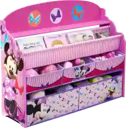 Make any bedroom or play space as sweet as can be with a little help from the Minnie Mouse deluxe book & toy organizer. Boasting a bright pink finish and colorful graphics of her favorite mouse, this handy book rack and toy storage solution features five storage bins plus a bookshelf to easily hold books and toys of all sizes. Customer assembly is required.