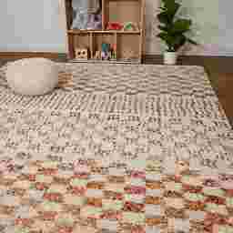 Polypropylene is a durable, synthetic "fabric family" material that offers a balance of softness and extreme resilience. It is highly resistant to fading and wear, ensuring the playful checkerboard pattern and muted rainbow palette remain vibrant even in high-traffic areas of your home.