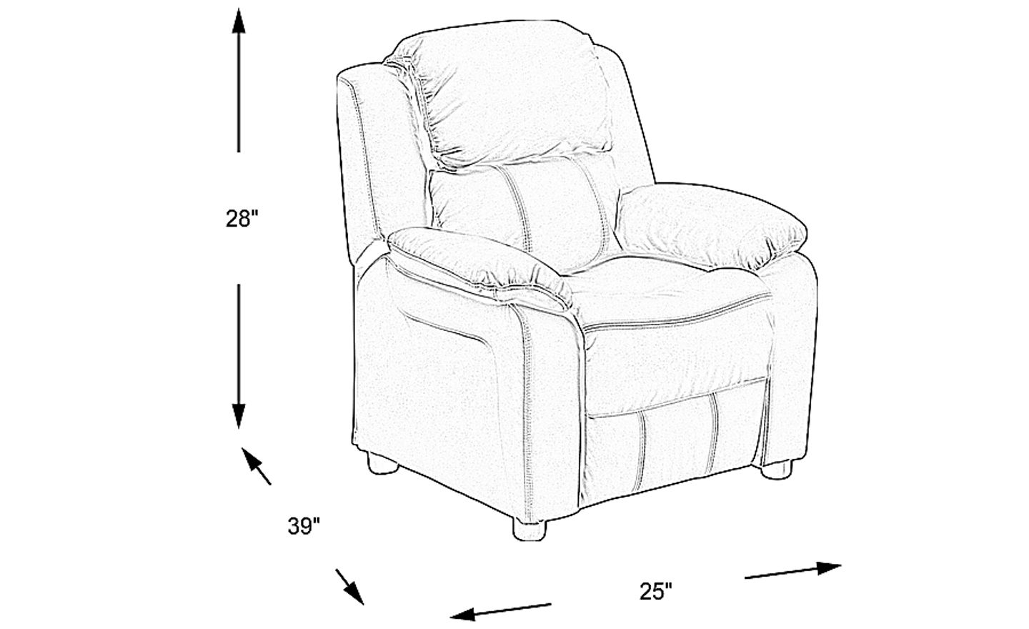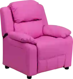 The Dreux child-sized recliner with deluxe padding is a perfect spot for kids to watch TV, play video games or read their favorite book. The chair features plush padding, vinyl upholstery and flip-up storage arms for remote controls, books and game controllers. This sturdy little recliner has a solid hardwood frame and durable upholstery that cleans easily with a damp cloth. It has raised black plastic feet and will hold up to 90 pounds. Designed with safety in mind, it's filled with foam and reclines only when a child is seated and the footrest is pulled out ones. This cozy kids recliner will be a great addition to your living room or your child's bedroom or playroom. Customer assembly is required.