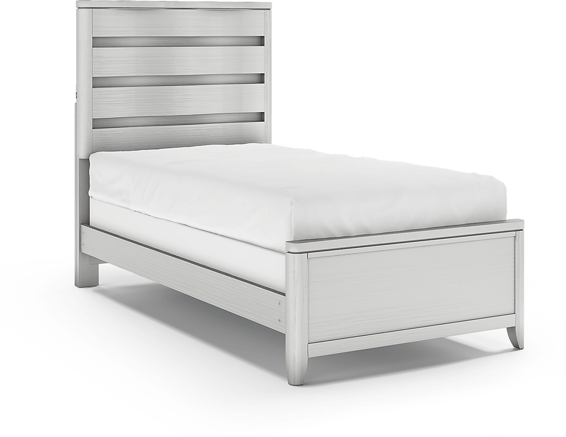 The Elliot Park bed is a perfect centerpiece for your child's bedroom. Crafted of pine solids and straight oak veneers, this bed is both stylish and built to last. The panel headboard features unique curving panels that create a raised effect that hides the built-in lighting, creating a distinct appearance for this piece. The sleek, platinum finish finishes this piece with timeless appeal. Mattress and foundation (if required) sold separately.