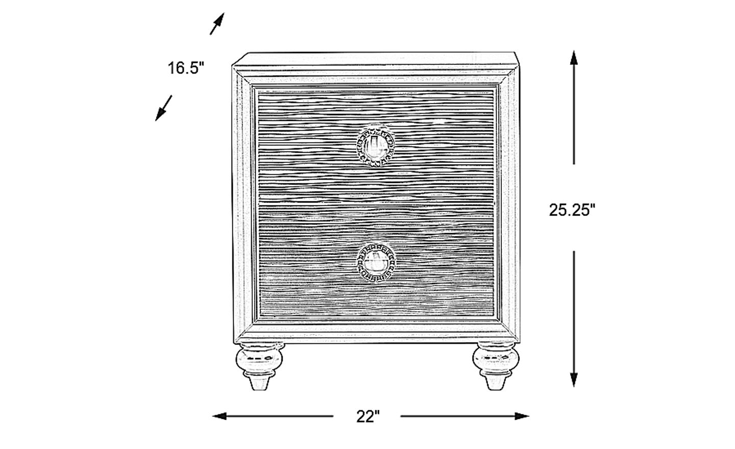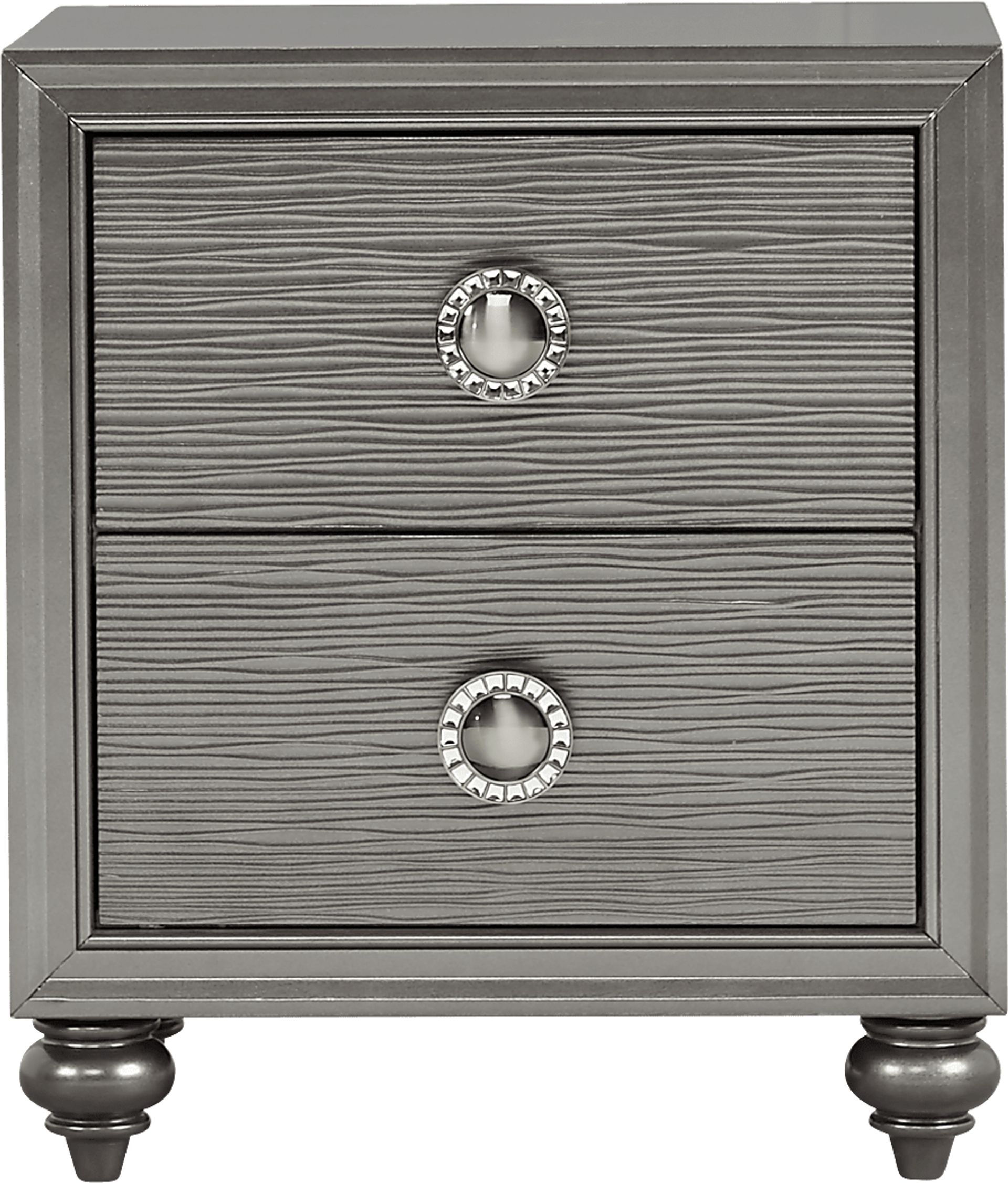 An excellent bedside companion, the Evangeline nightstand has two drawers perfect for storing items nearby. Featuring embossed wavy details on each of the two drawer fronts for a glam, contemporary look, it's crafted of wood solids in a chic charcoal finish. English dovetail joints and dust-proofing along the bottom drawer adds stability. Oversized round hardware and bun feet complete the sophisticated look.