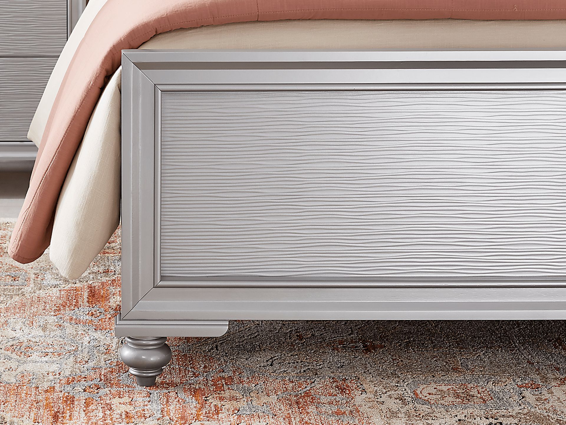 Curved lines and a decorative tufted upholstered headboard with LED lights give the Evangeline bed modern glam appeal. Crafted with wood solids in a chic silver finish, embossed wavy details on the footboard add even more beauty to this stunning piece. Add a trundle (sold separately) for more storage and organization potential! Mattress and foundation (if required) sold separately.