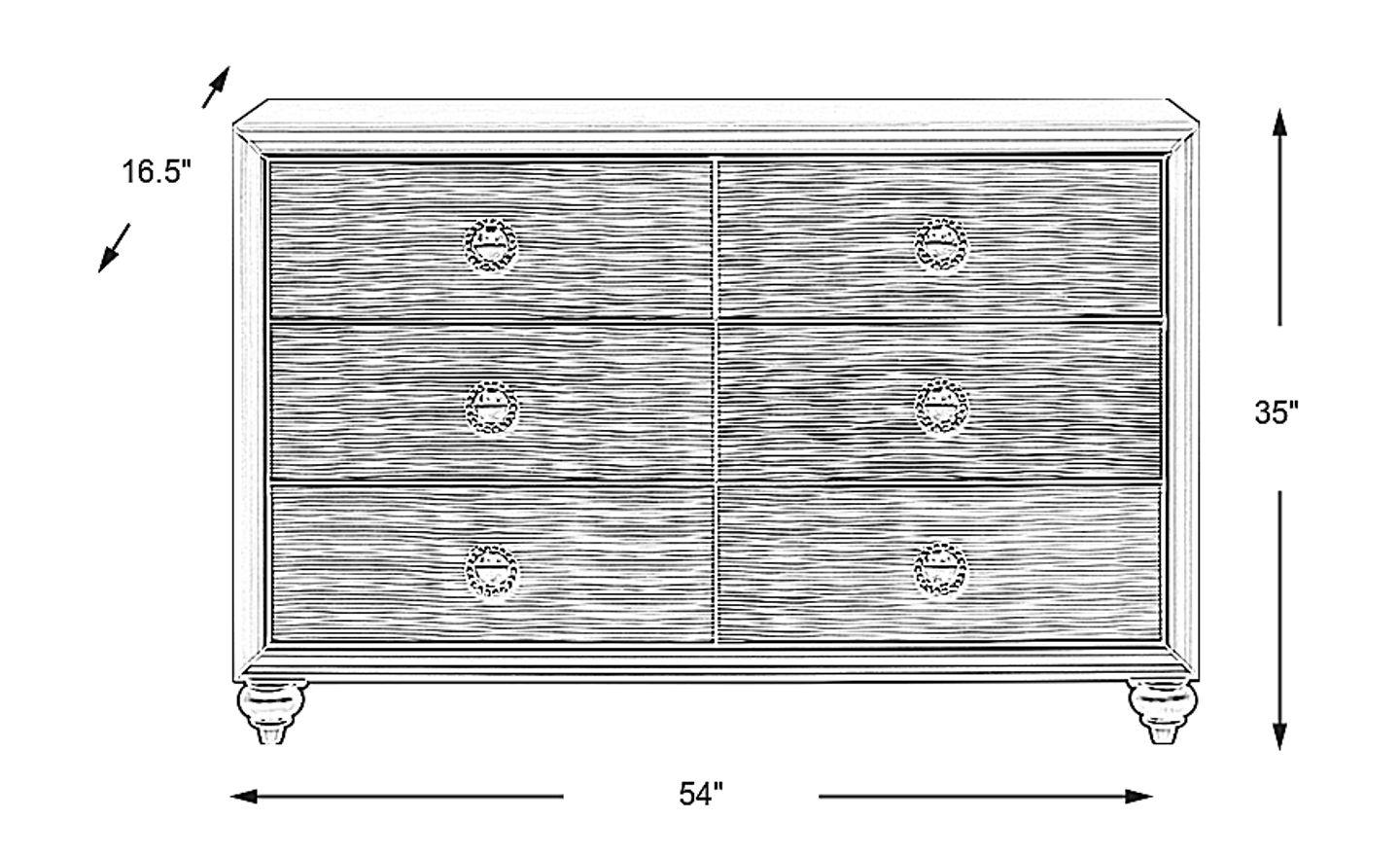 Delightful details give the Evangeline dresser a sense of glam and whimsy that will brighten up your child or teen's bedroom. Crafted of wood solids in a chic silver finish, embossed wave details on each of the six drawer fronts create a modern sense of movement and style. English dovetail joints add strength and stability, while dust-proofing along the bottom drawers keeps drawers free from dust and debris. Oversized round hardware completes the modern vibe.