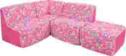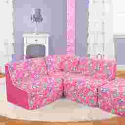 The Kids Everin pink sectional is the perfect spot for a child to read a book, watch a movie, or spend time with family and friends. It is constructed with a durable high-density foam core. It is upholstered in polyester microfiber with a multi-colored floral print on a bright pink background, with the sides in a solid bright pink. Both sides of the chairs and ottoman are trimmed with a white welt cord, while the backrests have a slight recline for added comfort. Matching handles on the top center backrests make the chairs easy to carry and reposition. The versatile modular design allows for the pieces to be arranged in a variety of configurations, while the bright floral fabric will immediately brighten a bedroom or playroom. Includes 4 pieces: 2 chairs that are 25 inches wide, 21 inches deep, and 22 inches high; 1 corner chair that is 20 inches wide, 20 inches deep, and 22 inches high; and 1 ottoman that is 21 inches wide, 21 inches deep, and 12 inches high. Upholstery: 100% polyester microfiber. Covers can be unzipped and removed for hand washing with cold water and allow to air dry or spot clean with damp cloth and cold water and allow to air dry. Seat Height: 12 inches. Maximum weight is 100 lbs each piece. Made in USA. Ships fully assembled.