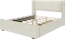Create the room of your dreams with the Evosa Upholstered Full Bed. Designed to cater to both kids and parents, this fabric bed frame combines function with fun, creating the ideal sleep and play space. With a frame made from knot-free, solid pine wood and sturdy engineered wood, it ensures unmatched durability and stability. The upholstered bed frame and its padded headboard makes it cozy. The fabric bed frame's strength is enhanced by its sturdy plywood slats, offering a 400-pound resting weight capacity. The bed's metal on metal structural connections ensure stability over time. Optional spacious storage drawers can be installed on either side of the bed for a design that best suits your room. Exterior drawer dimensions are 31.75in. L x 20in. W x 11.25in. H. Cleaning is just as easy - just spot clean with a damp cloth. This full-size bed frame for kids accommodates a standard full-size mattress that is at least 8 inches thick. Customer assembly is required.