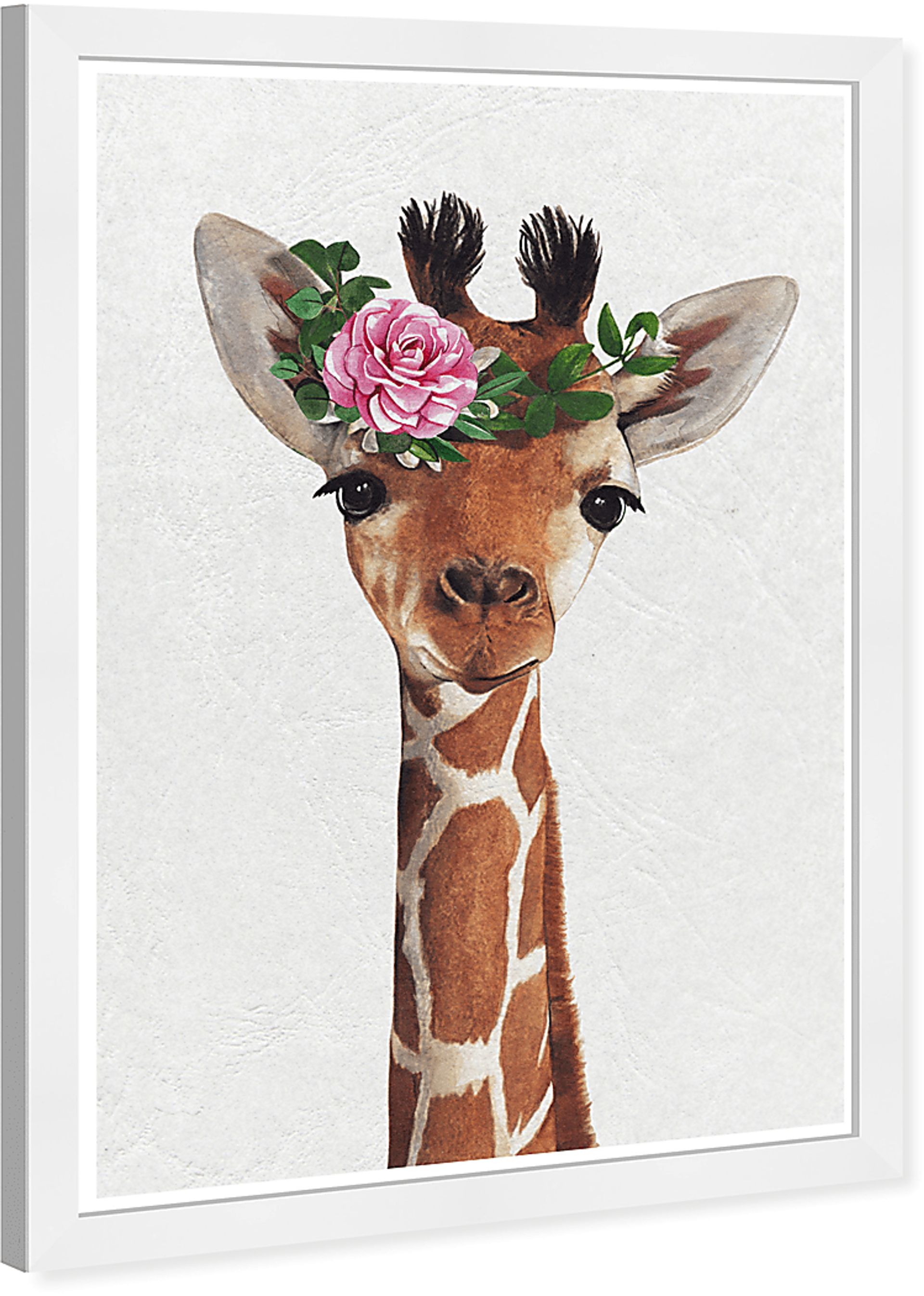 It's cuteness overload with the Flower Giraffe wall art. Printed with premium inks on high-quality canvas reveals rich colors and fine details while resisting fade. Finished in a satin white frame and fully assembled as shown. Customer assembly is required.