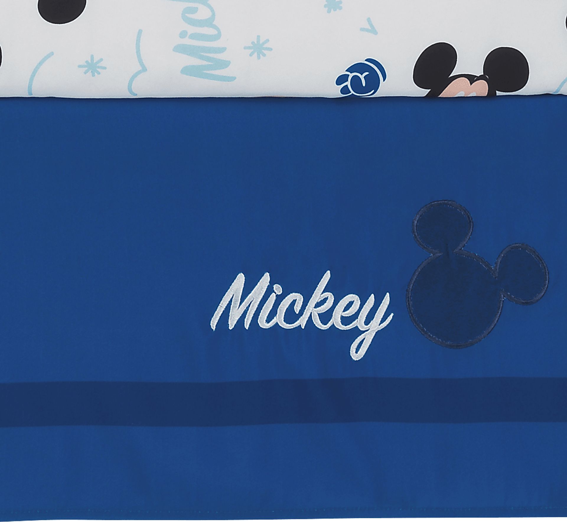 Welcome to the magical world of Disney. The officially licensed iconic Mickey Mouse character is featured on this colorful three-piece baby bedding collection. The crib bedding collection includes one quilt finished at 33 X 42, one fitted crib sheet, and one crib skirt dust ruffle-28 x 52. It is made of a soft microfiber material that is digitally printed in a high resolution which enhances the colors and is eco-friendly. Mickey Mouse is featured on the bottom right side of the quilt and has an appliqued face and ears with embroidered features. He stands proudly with his hands on his hips and loves wearing his favorite yellow shoes. He is also sitting on the top left-hand side of the quilt. He is approximately 14 tall and is sitting on a light gray grid pattern while resting his hands, with their white gloves, on his knees. He is wearing dark blue shorts. The bottom lower left of the quilt is printed with the word Mickey and is 12 long. Next to that is the word M