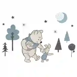 Yes, these decals are specifically designed for nursery and kids' environments. They are a safe decorative choice because they require no tape, tacks, or hardware, which eliminates small, sharp objects from your child's reach. The illustration features a charming Winnie the Pooh and Piglet theme in a soothing blue palette, making it an ideal choice for creating a calming and imaginative environment for a baby.