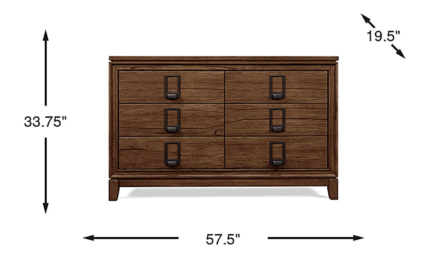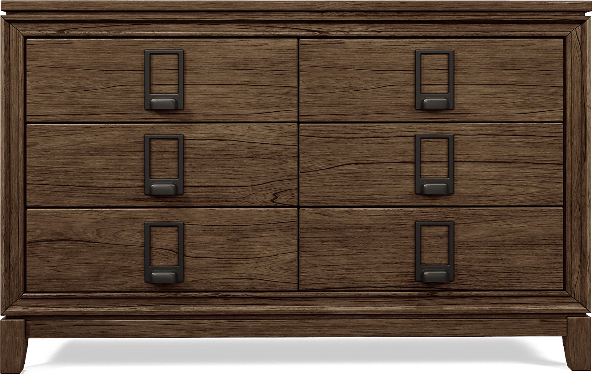 Sure to win over your sports fan, the Gallery Zone dresser scores big with robust contemporary style. Crafted of wood solids and Mindi veneers in a saddle brown finish, this dresser features a dust proof bottom with reinforced corner blocks and hidden parting rails. For enhanced support, all six drawers are configured with French dovetail fronts and English dovetail backs with center metal glides. The zinc alloy drawer pulls are finished in handsome dark charcoal with a slot designed to display your child's favorite trading cards. Decorative framing and square tapered legs provide perfect final looks.