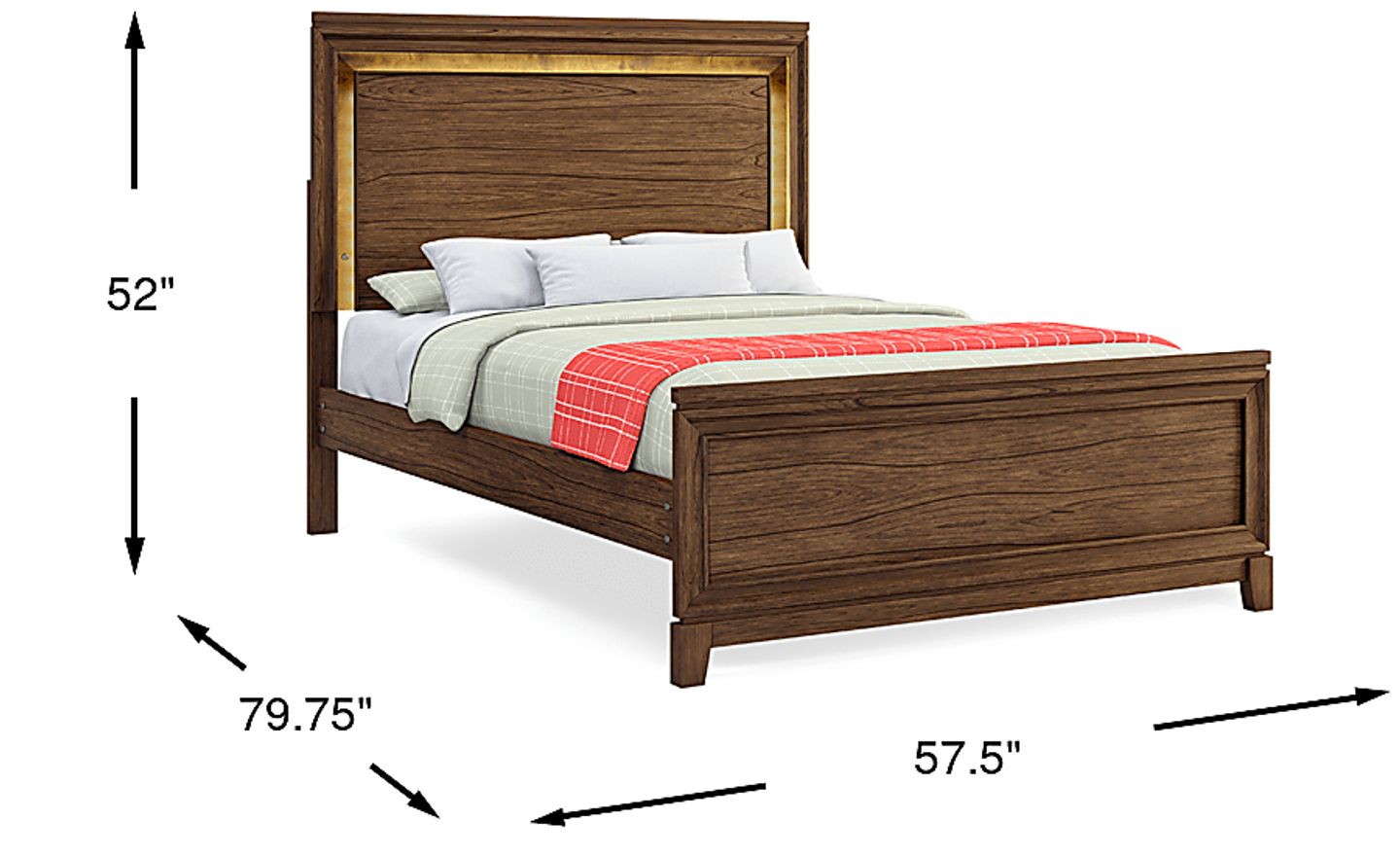 Sure to win over your sports fan, the Gallery Zone full panel bed scores big with robust contemporary style. Crafted of wood solids and Mindi veneers in a saddle brown finish, the headboard features a low voltage, 24-watt LED light frame with three-way touch button power. Decorative framing on the panel footboard highlights this bed's rich style profile while square tapered legs provide perfect final looks. Mattress and foundation (if required) sold separately.