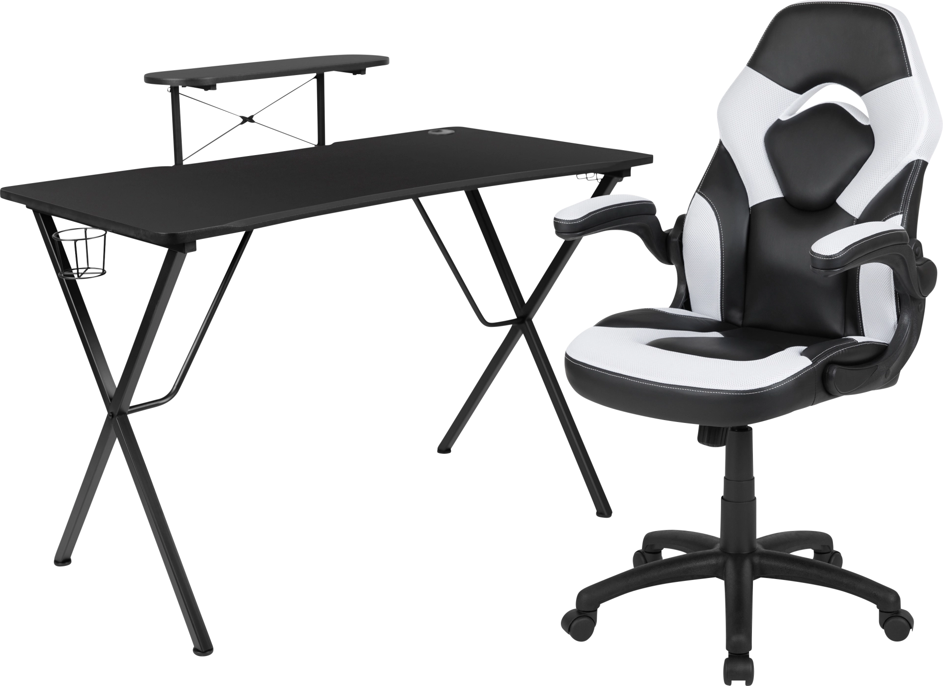 Let the games begin on the Gerro gaming desk and chair set. Not only cool to look at but the raised platform keeps your PC monitor at eye level, reducing neck strain. The black top gamers table has a grommet for cable management, a detachable cup holder and headset holder to keep you in game mode. The racing game chair have flip-up arms to comfortably rest your arms on while handling the controller or flip-up to slide under the desk. Be true to the gaming experience with a desk and chair combo designed for gaming systems. If you need more desk space, remove the platform to accommodate dual monitors. Use the cup holder to prevent beverages from spilling on your pc gaming keyboard. The comfortably padded black and white ergonomic gaming chair has a full swivel cylinder and adjusts with the pneumatic lever. Tilt back with ease by pulling the lever outward, control the force needed to recline by turning the knob underneath the seat. Made for gamers, this gaming desk and chair bundle will get you on your way to leveling up. Customer assembly is required.
