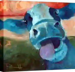 Goofy and colorful, this happy cow is ready to hang in your home. The Goofing Around artwork will bring a smile to your face and brightness to your room. The piece is stretched on 1.5" Giclee canvas and is easy to hang.