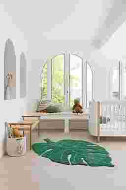 Inspired by nature, this soft rug is shaped like a Monstera leaf and brings the outdoors, inside. It's made with natural fibers and non-toxic dyes, so it's safe for kids. The cozy cotton base mixes olive and natural tones to mimic the textures of real leaves. Best of all, it's 100% machine washable-perfect for busy family life.