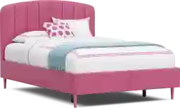 Soft, sweet and altogether spectacular, the Gwyneth bed is a gem for any kid's room. Fully upholstered with soft fabric in a bubble gum pink color, this full bed has a headboard with vertical channeling and a footboard with two storage drawers. Ball bearing glides make opening and closing the drawers easy. Featuring a "Grow with Me" design, two sets of feet are included with purchase. The first are rubber base glides that allow you to set the piece up as a Montessori-style platform bed. The second are taller, wooden legs that are painted to match the pink fabric. For convenience, you can even store the set of feet you're not currently using in a hidden compartment located on the headboard. Mattress and foundation (if required) sold separately.