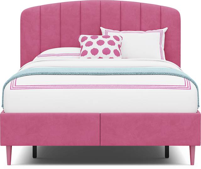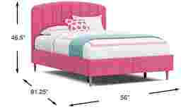 Soft, sweet and altogether spectacular, the Gwyneth bed is a gem for any kid's room. Fully upholstered with soft fabric in a bubble gum pink color, this full bed has a headboard with vertical channeling and a footboard with two storage drawers. Ball bearing glides make opening and closing the drawers easy. Featuring a "Grow with Me" design, two sets of feet are included with purchase. The first are rubber base glides that allow you to set the piece up as a Montessori-style platform bed. The second are taller, wooden legs that are painted to match the pink fabric. For convenience, you can even store the set of feet you're not currently using in a hidden compartment located on the headboard. Mattress and foundation (if required) sold separately.