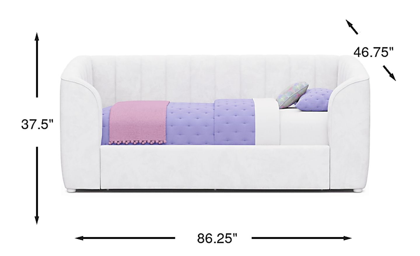 This daybed is designed with a high back and sides that feature vertical channeling, creating a cozy, lounge-ready look that transitions perfectly from a bed to a couch. The padded arms and fully upholstered frame provide a comfortable surface for sitting, reading, or watching movies, making it an excellent choice for a guest room or a child's bedroom that doubles as a play area.