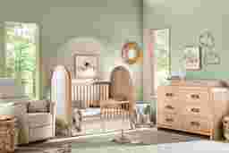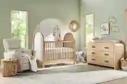 The light oak finish is applied to a durable wood construction, making it a resilient choice for various climates. In humid coastal regions or drier inland areas, quality wood furniture remains stable. To maintain the integrity of the oak finish and the wood itself, we recommend keeping the nursery at a consistent residential temperature and away from direct heating or cooling vents.
