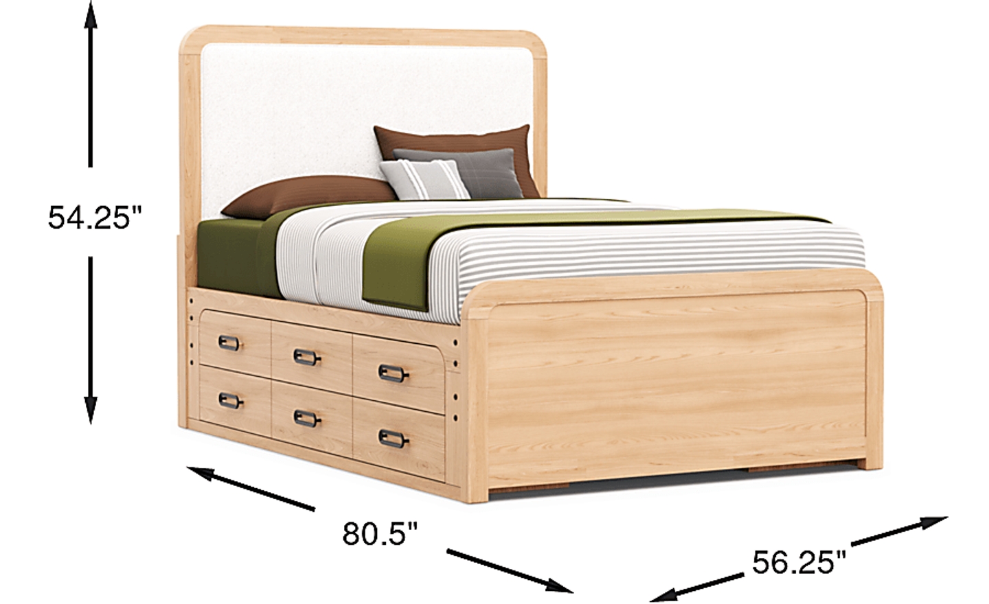 Discover cozy corners, secret spots and everyday surprises in the Hidden Hills bedroom collection by Drew & Jonathan. This bed features real oak wood veneers with a natural grain highlighted by a gentle, light finish that adds calm warmth to any child's space. Soft, snowy boucle on the headboard lends the panel design an even more relaxed look that melds effortlessly into your home. This set includes a matching pair of 6-drawer storage rails for each side of the bed, giving kids an easy place to tuck away books, treasures or bedtime necessities. Each offers built-in storage that runs the full length of the bed. Shaped with contemporary flair, the rails' drawer pulls are finished in oil-rubbed bronze for a final flourish that nails the piece's balance of simplicity and style. Mattress and foundation (if required) sold separately.