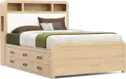 Discover cozy corners, secret spots and everyday surprises in the Hidden Hills bedroom collection by Drew & Jonathan. This bed features real oak wood veneers with a natural grain highlighted by a gentle, light finish that adds calm warmth to any child's space. The bed's bookcase headboard combines a trio of storage cubbies with a snowy boucle-upholstered panel, creating a cozy spot for lounging while keeping books and treasures neatly within reach. A white LED light strip and integrated USB-A and USB-C charging ports add tech-friendly convenience, while built-in cord management helps keep things tidy. The bed includes a matching 6-drawer storage rail, giving kids an easy place to tuck away books, treasures or bedtime necessities. The rail offers built-in storage that runs the full length of the bed. Shaped with contemporary flair, the drawer pulls are finished in oil-rubbed bronze for a final flourish that nails the piece's balance of simplicity and style. Mattress and foundation (if required) sold separately.