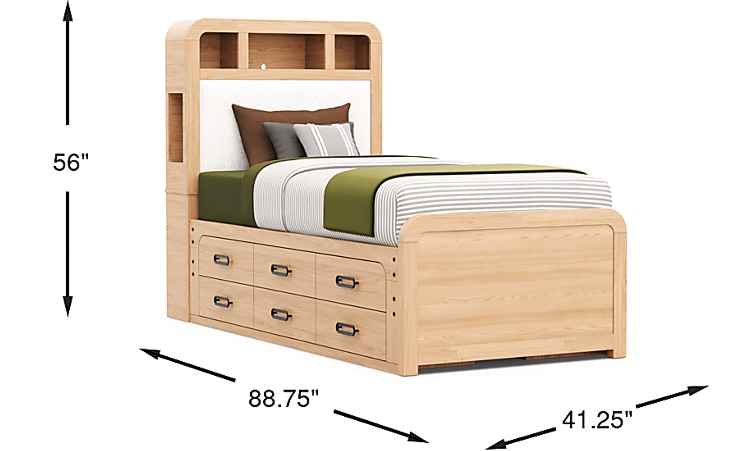 Discover cozy corners, secret spots and everyday surprises in the Hidden Hills bedroom collection by Drew & Jonathan. This bed features real oak wood veneers with a natural grain highlighted by a gentle, light finish that adds calm warmth to any child's space. The bed's bookcase headboard combines a trio of storage cubbies with a snowy boucle-upholstered panel, creating a cozy spot for lounging while keeping books and treasures neatly within reach. A white LED light strip and integrated USB-A and USB-C charging ports add tech-friendly convenience, while built-in cord management helps keep things tidy. The bed also includes a pair of matching storage rails, giving kids an easy place to tuck away nighttime necessities on both sides of the bed. This set includes a matching pair of 6-drawer storage rails for each side of the bed, giving kids an easy place to tuck away books, treasures or bedtime necessities. Each offers built-in storage that runs the full length of the bed. Shaped with contemporary flair, the rails' drawer pulls are finished in oil-rubbed bronze for a final flourish that nails the piece's balance of simplicity and style. Mattress and foundation (if required) sold separately.