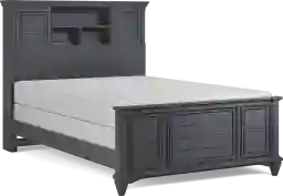 The Hilton Head bookcase bed is perfect for your bookworm, collector and every kid in-between. The timeless style of this bed is coupled with convenient built-in shelving in the headboard that helps keep everything at arm's reach and a footboard that features a shutter look. Two sliding panels on tracks provide a mix of concealed and display storage while built-in wire management holes prevent clutter. Finished with a versatile graphite paint, this bed is a great centerpiece for your child's bedroom. Mattress and foundation (if required) sold separately.