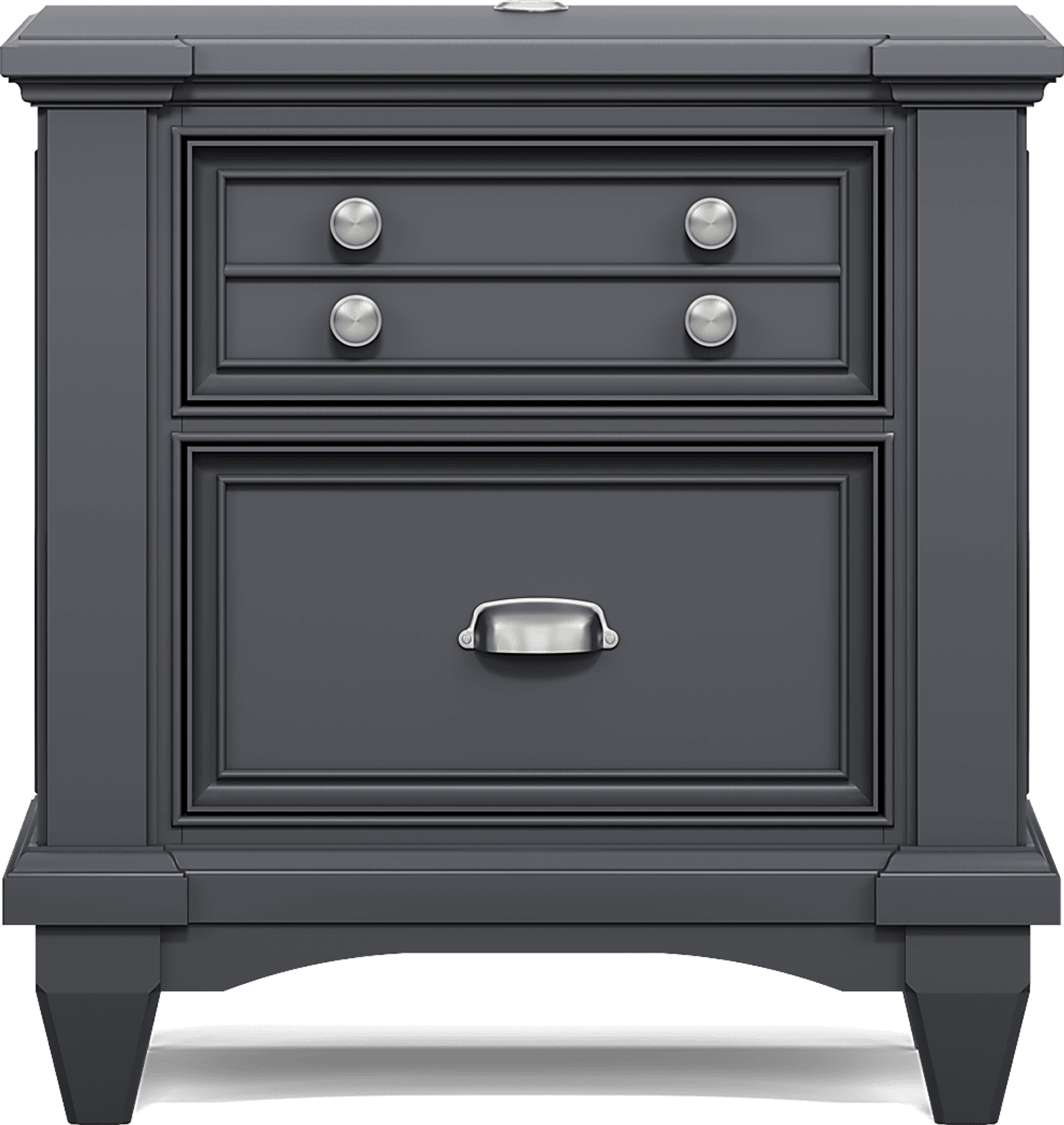 The charming Hilton Head nightstand is the perfect bedside companion for your child. Two drawers offer plenty of bedside storage and maintain a stylish appearance with metal hardware in an attractive nickel finish. The wood solid construction makes this nightstand durable while the clean graphite finish makes this piece a must add to any kids' bedroom. Two built-in USB ports make sure the ability to charge devices is always available.