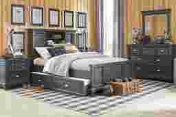 The Hilton Head bookcase bed is perfect for your bookworm, collector and every kid in-between. The timeless style of this bed is coupled with convenient built-in shelving in the headboard that helps keep everything at arm's reach and a footboard that features a shutter look. Two sliding panels on tracks provide a mix of concealed and display storage while built-in wire management holes prevent clutter. Finished with a versatile graphite paint, this bed is a great centerpiece for your child's bedroom. Mattress and foundation (if required) sold separately.