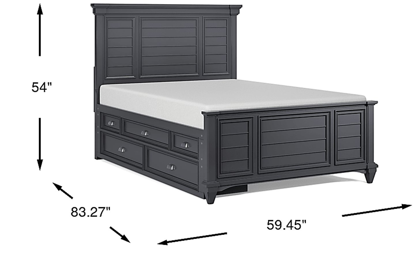 Great for kids and teens, the classically styled Hilton Head panel bed will be an instant hit. This transitional bed features a unique shutter look on the headboard and footboard helping it stand out. The versatile graphite finish helps this bed fit in with many decor styles, while the combination of wood products and solid wood molding makes for a quality piece to center any child's room. The storage side rail has brushed nickel pulls alongside decorative moldings that create a spectacular under the bed storage solution for either side of the full bed. Featuring five drawers, this piece is designed to provide quick and convenient access to bedtime essentials with plenty of room for blankets, pajamas and more. Mattress and foundation (if required) sold separately.