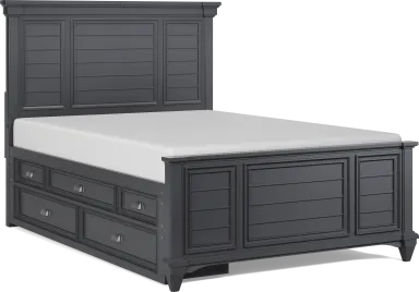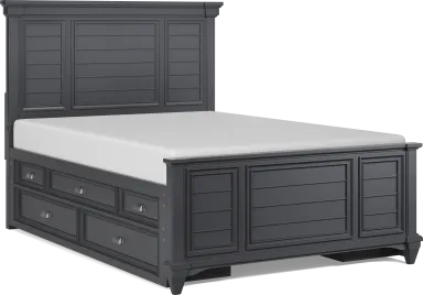 The shutter-style headboard adds significant architectural interest and texture to a room. This design feature provides a classic "coastal" or "transitional" aesthetic that serves as a sophisticated focal point. Because the look is rooted in traditional craftsmanship but updated with a graphite finish, it offers a high-end feel that elevates the overall design of the bedroom.
