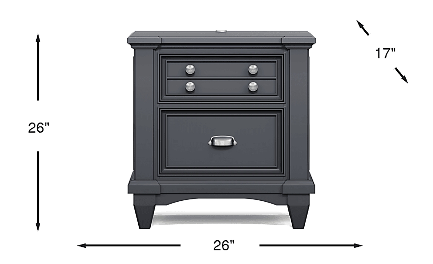 The charming Hilton Head nightstand is the perfect bedside companion for your child. Two drawers offer plenty of bedside storage and maintain a stylish appearance with metal hardware in an attractive nickel finish. The clean graphite finish makes this piece a must add to any kids' bedroom. Two built-in USB ports make sure the ability to charge devices is always available.